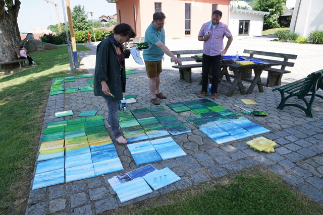 Anschließend wurden sie in Kleingruppen eingeteilt, in denen für das spätere Gesamtbild der Hintergrund mit einer ersten Deckschicht anzufertigen war. Jede Gruppe wählte einen bestimmten Farbton. Für das Gemeinschaftsbild wurden in den Kleingruppen die Farben des Himmels, Grün- und Grautöne für den Mittelteil (Silberberg) und die Erdtöne für den untersten Teil des Kunstwerkes herausgearbeitet.