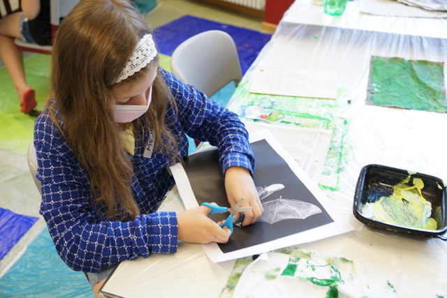 Die Kinder sollten sich überlegen, welche Kriterien für die Umsetzung des jeweiligen Themas von Bedeutung ist oder welche Besonderheiten zu beachten sind, die möglicherweise auf dem Gesamtkunstwerk festgehalten werden sollten. Sie sollten haptisch erkunden, wie man strukturelle Eigenschaften, wie z.B. Gestein, Äste, Erde, Rinde oder Gräser gestalterisch darstellen kann. Für das Zweitthema „Fledermaus“ musste sowohl der Lebensraum der Tiere, ihre Nachtaktivität, die für die Hintergrundgestaltung von Bedeutung war, der Körperbau und die verschiedenen Flugstellungen im Vorfeld erarbeitet werden. Ebenso musste auf die Details bei der Darstellung der Flügel geachtet werden und welche Bedeutung der Lichteinfall auf die Schattenbildung.